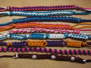 Jau kādu mēnesi esmu iesaistījusies kādas firmas mārketinga programmā, kuras ietvaros mans uzdevums bija uzmezglot vienkrāsainas rokassprādzes no sutažas, izmantojot dažādas krāsas un plakano mezglu. Nezinātājiem-tas ir pats vienkāršākais mezgls, kuru bieži vien izmantojam sadzīvē (kaut vai sasienot kurpju auklas). Rokassprādzīšu gali bija jānoformē ar metāliskiem bumbulīšiem.