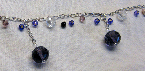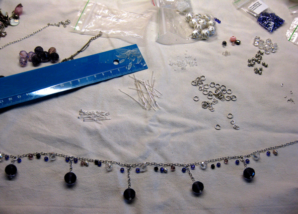 Dažas pērlītes pasūtītājs man iedeva no kāda cita komplekta, bet dažas piepirku klāt. Visas pērlītes pamata ķēdītei pievienoju ar nagliņām un riņķīšiem. Tās, kurām vajadzēja atrasties nedaudz zemāk par pārējām, iekāru nelielā ķēdes posmā.