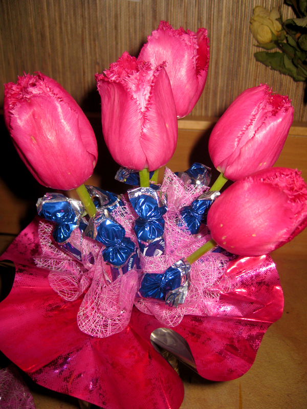 Manai radiniecei maijā bija dzimšanas diena, un es nolēmu sagādāt viņai jauku pārsteigumu. Es viņai uztaisīju konfekšu pušķi ar svaigām tulpēm. Ziedi un papīrs bija rozīgos toņos, bet konfektes- lai izceltos- zilā papīrā (“Vētras putns”). Katru konfekti reizē ar dāvanu papīru pietinu drātiņai. Šādi sataisīju 9 konfektes. Pēc tam kārtoju pušķi no konfektēm un tulpēm. Pušķa pamatam izmantoju citu dāvanu papīru un visu cieši sasēju.