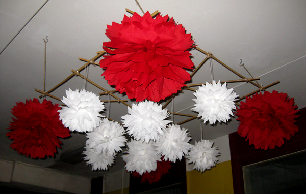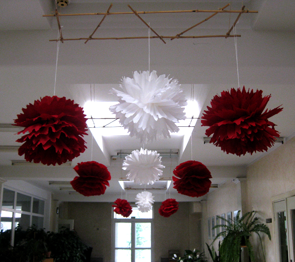 Lai izgatavotu kreppapīra bumbu-pušķi, būs nepieciešams kreppapīrs, šķēres, metāliska stieple, aukliņa.