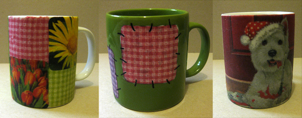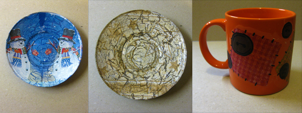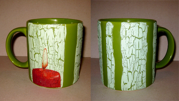 Dekupētas dāvanas3Attēlos ir dekupētas krūzes,  stikla burciņa un šķīvīši. Darbiņus iesaiņojot, pievienoju klāt arī sveci. Apdāvinātie bija ļoti priecīgi par manis gatavoto mīļo pārsteigumu.