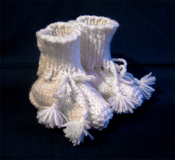Lai tādus zābaciņus uzadītu, jāuzmet divas reizes vairāk valdziņu kā pēdiņas garums. Tad seko rievotais adījums, labiskais adījums ar priekšdaļas noraukumu. Pēc tam ada rindu ar 2 saadītiem valdziņiem un apmetumu, kurai seko valnīša daļa. Izadīto detaļu pārloka uz pusēm un sašuj, veidojot zābaciņus. Tas tā- ļoti īsumā…