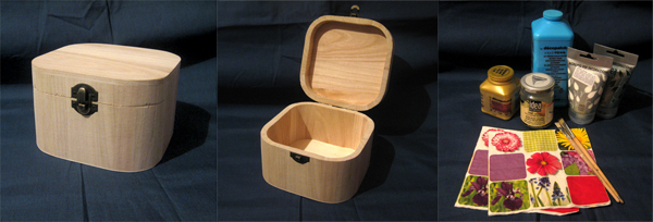 Kastītes sākuma izskats un nepieciešamie materiāli-balta un zaļa akrilkrāsas, vienkomponentu plaisu laka, dekupāžas līme, apdrukātas salvetes, noslēguma laka, otiņas, šķēres (kuras diemžēl attēlā nav).