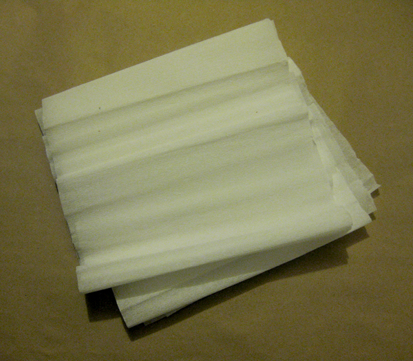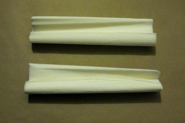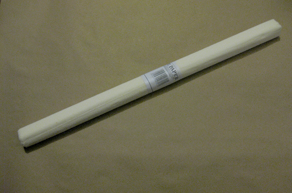 1. Kreppapīra iepakojumu (izmērs 0,5×2 m) pārgriežu uz pusēm. Rezultātā iegūstu 2 loksnes, kurām, atrullējot vaļā, aptuvenais izmērs ir 0,25x2m